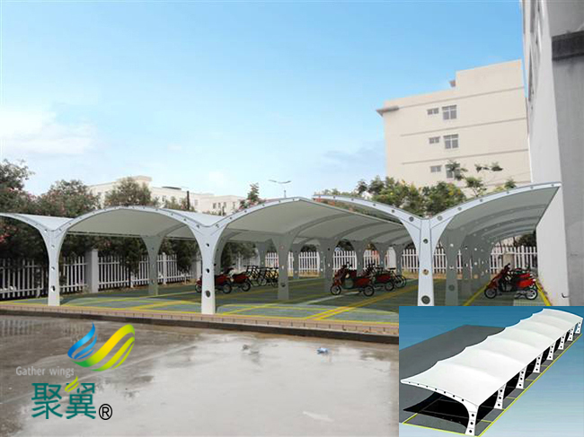 膜結構車棚自行車棚在最初是作為一種能提供給車輛停泊的地方,使車輛避免了直接面對風吹雨打。膜結構車棚用來保證自行車,汽車等在車棚下不受損傷。