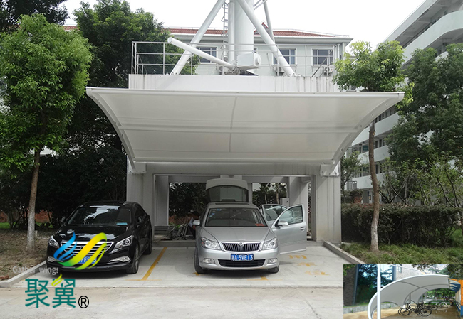 膜結(jié)構(gòu)車棚本身是依靠膜自身的張拉應(yīng)力與支撐桿和拉索共同構(gòu)成的體系,此結(jié)構(gòu)特別適合用來建造城市標志性建筑物,如體育與娛樂性場館,廣告效應(yīng)的商場、餐廳、城市的命脈的關(guān)鍵性建筑,這時新型膜材用于此可以體現(xiàn)出更好的益處。