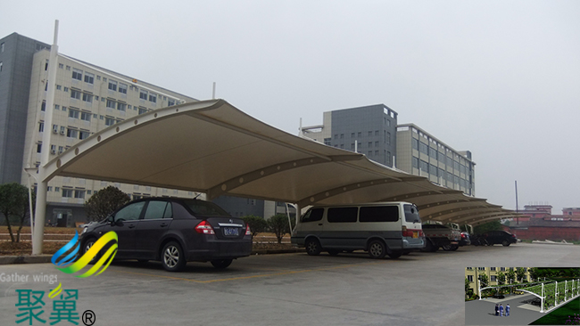 江蘇省淮陰市漣水縣膜結構車棚本身是依靠膜自身的張拉應力與支撐桿和拉索共同構成的體系,此結構特別適合用來建造城市標志性建筑物,如體育與娛樂性場館,廣告效應的商場、餐廳、城市的命脈的關鍵性建筑,這時新型膜材用于此可以體現出更好的益處。