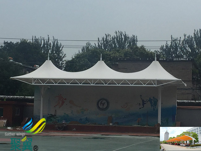 膜結構車棚的篷布材質是膜結構,而膜材的最大特點是強度高、耐久性好、防火難燃、自潔性好,不受紫外線影響,使用壽命長,一般15-30年。以上是由聚翼膜結構廠家提供的
