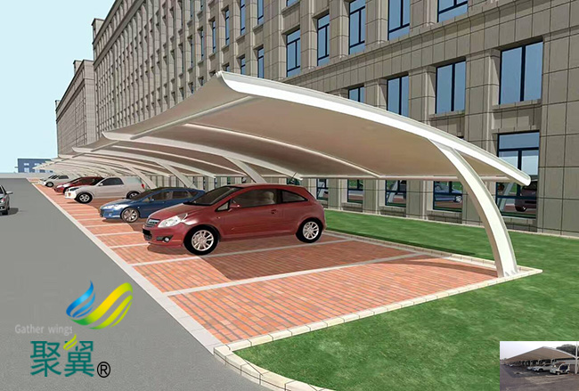 膜結構車棚本身是依靠膜自身的張拉應力與支撐桿和拉索共同構成的體系,此結構特別適合用來建造城市標志性建筑物,如體育與娛樂性場館,廣告效應的商場、餐廳、城市的命脈的關鍵性建筑,這時新型膜材用于此可以體現(xiàn)出更好的益處。