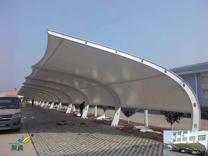 3、膜結構車棚具有極短的施工周期。膜結構車棚的一切設計,加工,制作都可以在工廠完成,在現場只要安裝作業。相比傳統建筑工期縮短了2倍。