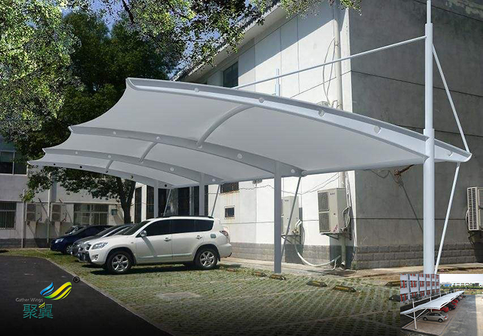 膜結(jié)構(gòu)車棚,是以建筑織物,即膜材料為張拉主體,與支撐構(gòu)件或拉索共同組成的結(jié)構(gòu)體系,它以其新穎獨(dú)特的建筑造型,良好的受力特點(diǎn)——成為大跨度空間結(jié)構(gòu)的主要形式之一。膜材料是指聚酯纖維基布或PVDF、PVF、PTFE等不同的表面涂層,配以優(yōu)質(zhì)的PVC組成的具有穩(wěn)定的形態(tài),并可承受一定載荷的建筑紡織品。它的壽命因不同的表面涂層而異,一般可達(dá)成10-20年。