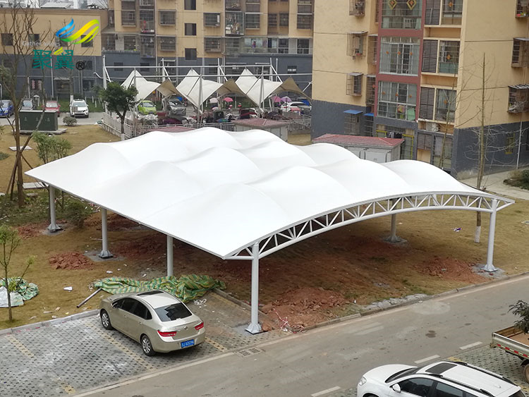 有的車棚采用永久性膜材,可使用四十年。特別是遇到劇烈的暴風雨天氣,膜結構建筑巍然不動,毫發不損。藝術性:除了一般雨蓬不可比擬的實用、耐用、遮風擋雨的功能外。