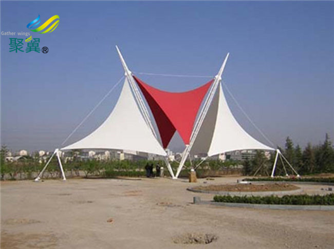 因此膜結(jié)構(gòu)建筑具有造型自由流暢、以曲面為主、色彩豐富、造型多變、富有結(jié)構(gòu)美的特點。他們的展示語言和技巧極為豐富,富有創(chuàng)造性和藝術(shù)性。這使得膜結(jié)構(gòu)在景觀領(lǐng)域的應(yīng)用更加廣泛。