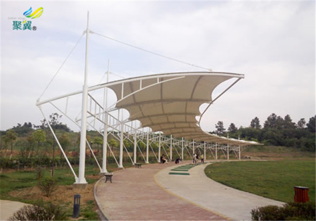 膜結構做為停車棚,在現代生活中應用十分廣泛,從形態上也具有多變的特性,可以滿足于各種環境場合的設計要求,又有完美的表現力。膜材都是柔性材質,能任意變形,要保持一定形態的曲面就必須有一定程度的張拉力,使膜面平整有一定的支撐力,能抵抗大風暴雨,又有美觀的形體。