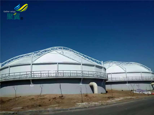 我們要選擇的材料是要壽命長、耐性好、抗風雨,不容易撕裂漏氣的膜材,污水池加蓋膜結構就是一個不錯的選擇。對于池體惡臭氣體收集的有用方法便是對污水池進行加蓋密封,再經過進風口和出風口進行換氣,把惡臭氣體抽送到智力設備中進行除臭處理。