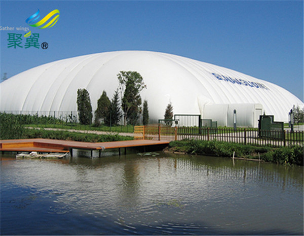 氣承式膜結構建筑除了應用于天線的圍護結構(天線罩)、臨時的倉庫、就地儲存庫、物料遮蓋倉庫、建筑的圍護結構、游泳館以及其他體育娛樂館、展覽館、室內避難場所等。這些應用一般都是應用了氣承式膜結構的基本特性,便攜式、可移動和速度快和拆解容易。