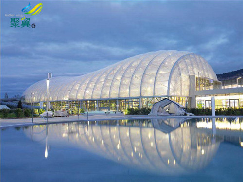 在日后的發(fā)展過(guò)程中,膜結(jié)構(gòu)表現(xiàn)出了不少特有的優(yōu)勢(shì),如阻燃性能好、外型新穎美觀、自重輕、跨度大、工期短等。目前常用的膜材都具有良好的阻燃性能或不燃性,膜材色彩豐富,支撐結(jié)構(gòu)和柔性膜材可以使建筑物造型更加多樣化;膜材自重輕,因此膜結(jié)構(gòu)建筑特別適合地震多發(fā)區(qū),也使得膜結(jié)構(gòu)建筑可以實(shí)現(xiàn)大跨度覆蓋空間