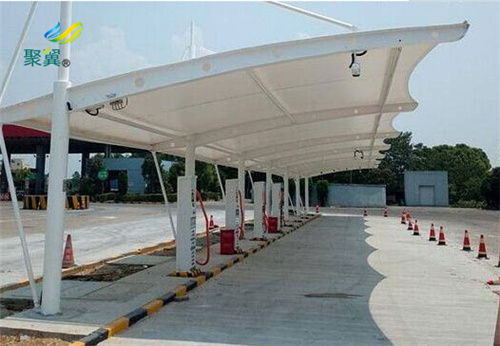 膜結構車棚在室內人們對白色或米白色膜材會有很好的顏色感知,由于這兩種顏色表現出對可見光具備線性光譜透射的特征。透射程度隨透射光波長的增加而增加,這使得透射光比入射光略溫暖。透射光譜與纖維及其特性、涂層的厚度以及附加面層有差,生產商應給出更多的詳細信息。相對于涂覆PVc的聚酯纖維膜材,涂覆PTFE的玻璃纖維膜材的透射光譜。