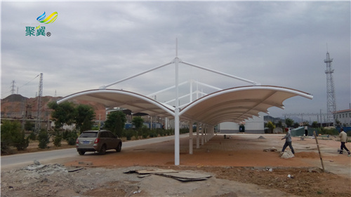 膜結構停車棚的整體結構由方形鋼焊接成型龍骨架制成。整體結構經過防銹處理。防銹底漆刷了三遍。外部涂有白色汽車漆。停車棚的主要支柱通常由220毫米鋼管或工字梁制成。車棚的支撐柱,車棚的整體結構堅固,具有較高的抗震,防風系數和耐腐蝕性。