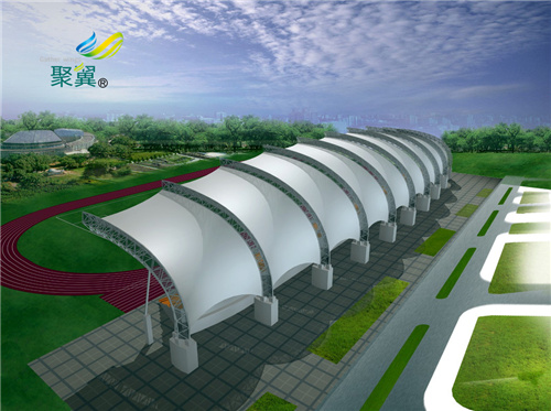3.大型膜結構車棚球場都是和膜結構看臺一樣采用剛性骨架結構,所以必須保證鋼結構的鏈接到位牢固,做好防腐蝕處理這樣才能使得工程質量到位。節點,膜材與結構的節點,地基節點,膜材拼接的節點和結構鏈接的節點,這些節點是形成膜結構的關鍵,膜材的節點關系到膜結構的穩定,這些節點是膜材受拉力的地方,膜結構靠的就是這樣的拉力形成內應力來維持膜結構的形狀。節點要充分保證其牢固和可活動性。
