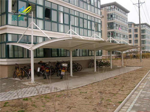 膜結構自行車車棚是由多種高強薄膜材料及加強構件(鋼架、鋼柱或鋼索)通過一定方式使其內部產生一定的預張應力以形成某種空間形狀,作為覆蓋結構,并能承受一定的外荷載作用的一種空間結構形式。