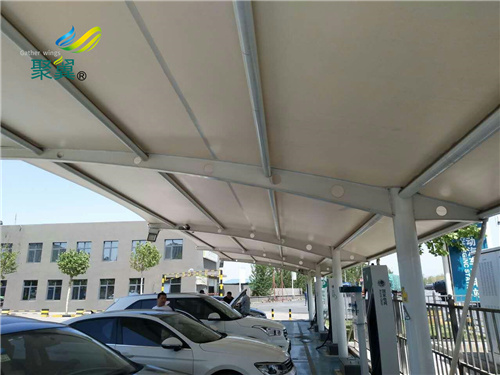 膜結構車棚,或者是具有張力而且安穩的雙曲折鞍形形狀。張力和安穩性來自于膜平面及其線性鴻溝的機械預應力。