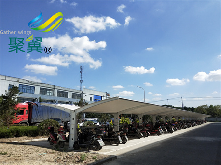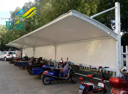 現在很多場所在搭建自行車、電動車 棚時,都會選擇膜結構車棚,鋼結構材質作為產品的骨架,室外建筑膜材作為產品頂棚的材質,而膜材的最大特點是強度高、耐久性好、防火難燃、自潔性好,不受紫外線影響,使用壽命長,一般15-30年。
