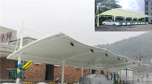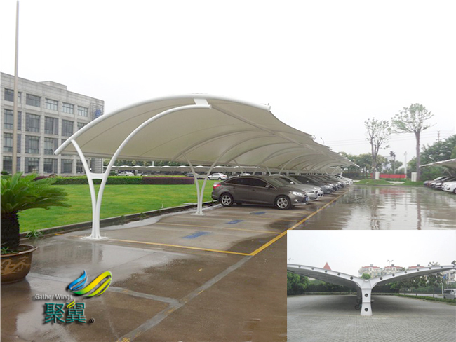 膜結構車棚抑制車內溫度上升(有效抑制由于太陽直射引起的車內高溫,進蒸籠的感覺不見了。)膜結構車棚連接設計:包括螺栓、焊縫和次要構件尺寸。膜結構車棚剪裁設計:這一過程應具備必要的試驗數據,包括所選用膜結構車棚膜材的楊氏模量和剪裁補償值(應通過雙軸拉伸試驗確定)。