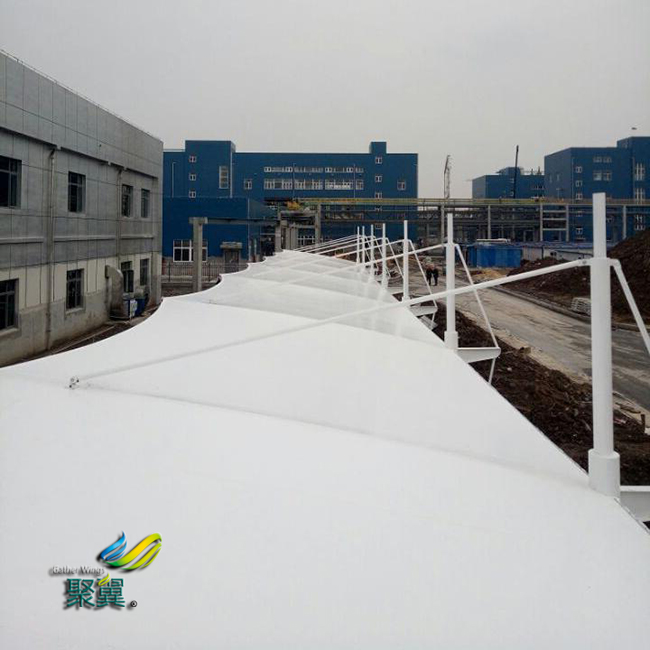 膜結構車棚是在超細玻璃纖維織物上涂以聚四氟乙烯樹脂而成的材料。膜結構車棚膜材有較好的焊接性能,有優良的抗紫外線、抗老化性能和阻燃性能。