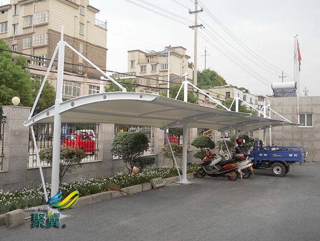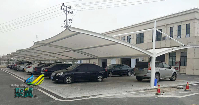 膜結構車棚荷載態分析:張拉膜結構車棚自身重量很輕,僅為鋼結構的1/5,混凝土結構的1/40;因此膜結構車棚對地震力有良好的適應性,而對風的作用較為敏感。此外還要考慮雪荷載和活荷載的作用,由于目前觀測資料尚少,故對膜結構車棚的設計通常采用安全系數法。