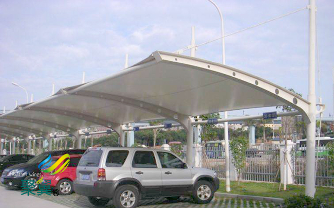 預張力和二次張拉,膜結構車棚的穩定依賴于膜結構內的預應力的保持。預應力的水平影響膜在荷載作用下的變形。因為膜結構在荷載的持續作用下會產生松弛,所以在使用期間膜結構車棚膜內預應力會發生變化。用于特定結構的膜材性能可以通過雙軸實驗來確定,并應用于預應力設計中。處理膜結構車棚膜材在使用期間產生的松弛和徐變的處理方式有兩種,其一是安裝時施加一個較高的初始應力,其二是使用一段時間之后實施二次張拉。