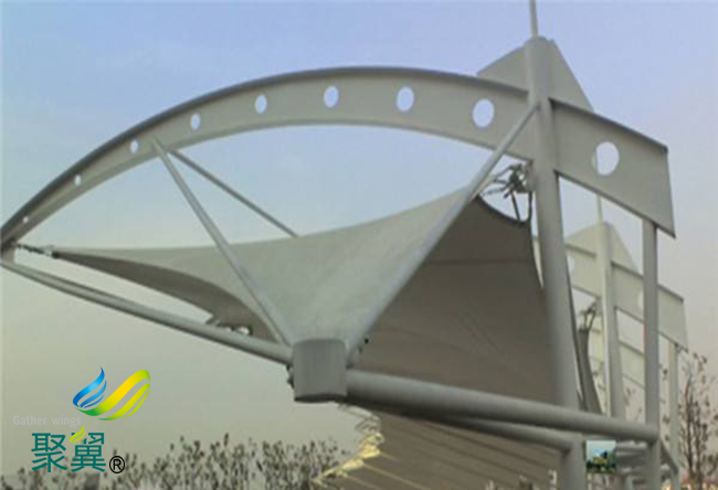 膜結構車棚PVC膜材一般采用表面涂層的處理方法把容易揮發的添加劑密封在膜結構車棚膜材體內,以此保持膜結構車棚PVC的柔韌性,增強壽命。
