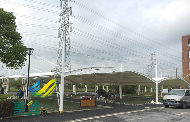 膜結構車棚膜片,膜材裁剪后形成的單元。膜結構車棚預張力,以機械或其他方法,預先施加于拉索或膜片上的力。