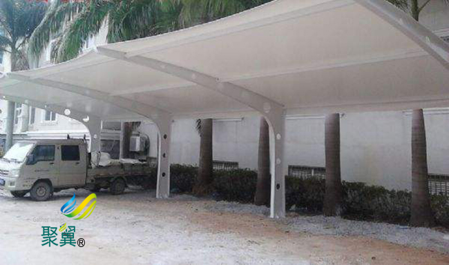 膜結構車棚的表層潤滑,膜結構車棚具有彈性,大氣中的塵埃、化學物質的微粒極難附著與浸透,經雨水的沖刷修建膜可恢復其原有的清洗面層與透光性。