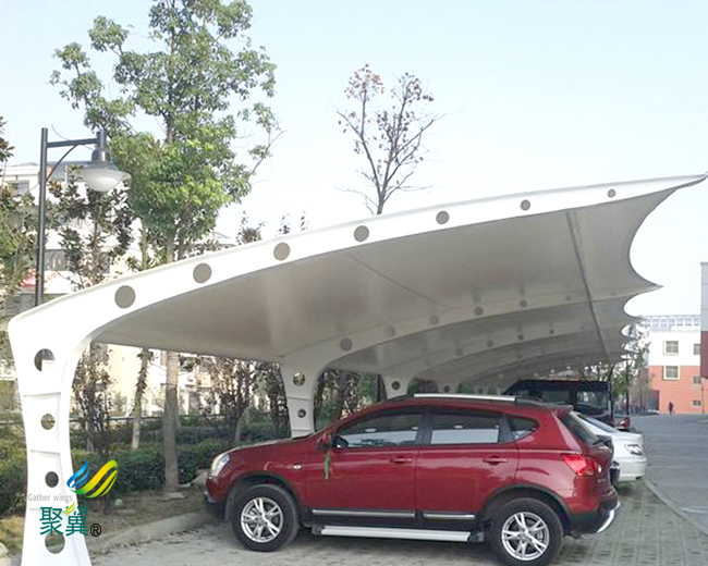 在遇到危機事端時,通過健壯的抗沖擊性,下降車輛的碰擊丟掉。再次,規劃漂亮,膜結構車棚具有裝修性。除了實踐成效外,現在的車棚規劃越來越尋求視覺作用,如同藝術品相同,讓人享用美感。尤其是膜結構車棚跟鋁合金車棚,曲線愈加柔美,造型豐盛多樣。