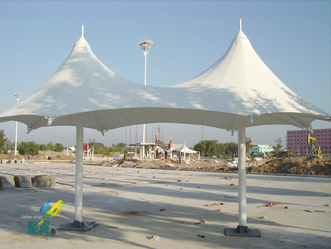 膜結構車棚除了一般雨蓬不可比擬的實用、耐用、遮風擋雨的功能外,膜結構雨蓬更是一座雕塑,一件藝術品,膜結構車棚給人美的視覺享受。其柔美,其曲線,其剛柔并濟,其豐富造型,膜結構車棚潔白無瑕,讓人 眼前一亮,回味悠長。