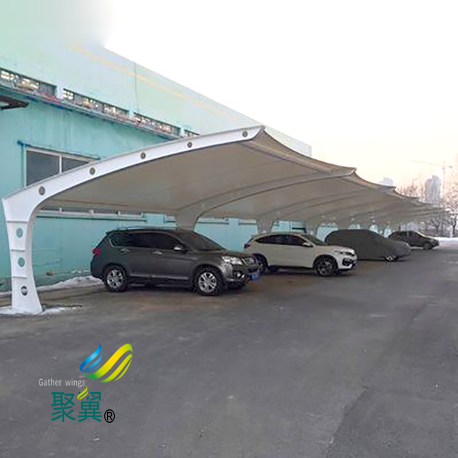 膜結構車棚景觀自動清洗。膜結構建筑中采用了具有保護涂層的膜材料,具有良好的自清洗的結果。膜結構車棚可以利用雨水的自然沖刷來清潔建筑物的外觀,也可以增加建筑物的使用壽命,膜結構車棚還具有運輸方便、比較新并且方便、不易積雪等優點。