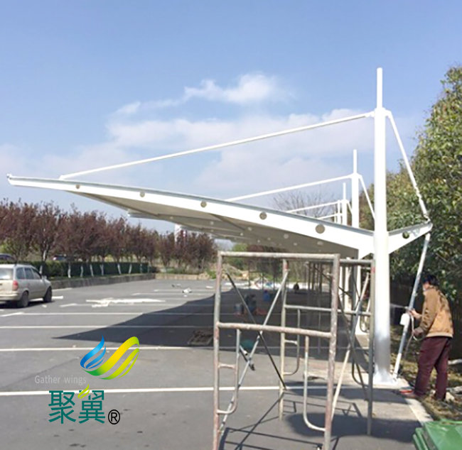 自潔性。膜結構車棚建筑在設計的時候本身外層具有一定的防護涂層,這種涂層帶有很好的自身清潔的作用,可以有效延長膜結構車棚的使用壽命。