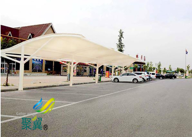 膜結構車棚材料內部涂層具有較高的反射率,能在夜間保持棚內的照明效果;夜間逆光照射下表面發光;膜結構車棚自然照明,節省能源。