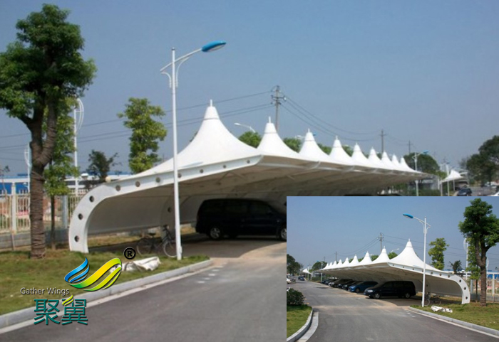 二、膜結構車棚吊裝或張拉膜面的時候,要確保膜面不接觸尖銳物品以防被劃破劃傷,對于膜面提升過程中有可能接觸到的尖銳部位要提前用柔軟物體進行包覆