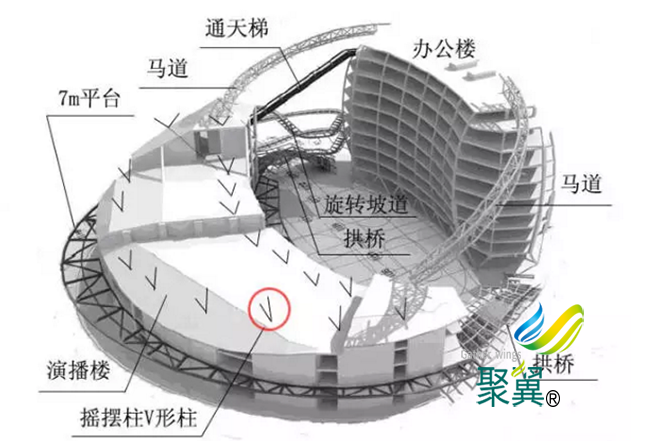(2)演播樓采用框架-剪力墻結構,演播樓最大平面輪廓尺寸約為111.6m×39m的蠶豆形,見圖2,立體外形呈土豆形。內側墻體隨層高向里傾斜,兩側向外傾斜,混凝土頂板為不規則坡起。屋頂設置了16根搖擺柱支承罩在上面的鋼結構。