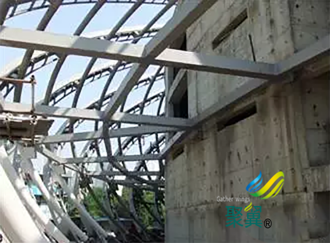 (5)罩在辦公樓與演播樓上的是一個屋蓋外殼鋼結構,見圖4。在地上屋蓋鋼結構從±0.00標高起,將辦公樓和演播樓連為一體。外殼鋼結構主要支承體系有四大部分:1)鋼結構直接落地(圖5中黑粗線部分);2)辦公樓外掛支座(圖6);3)演播樓頂搖擺柱V形柱(圖7);4)空腔部分支承在拱橋上。另外,在演播樓7.0m標高處設有一圈鋼結構平臺,一端與演播樓鉸接,另一端與外殼鋼結構采用滑動支座連接(圖7)。圖8,9為搖擺柱V形柱和7m平臺的施工照片。