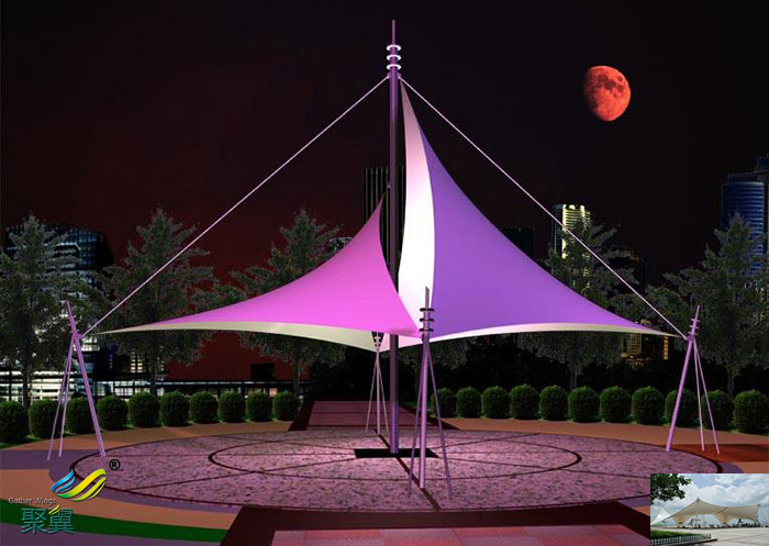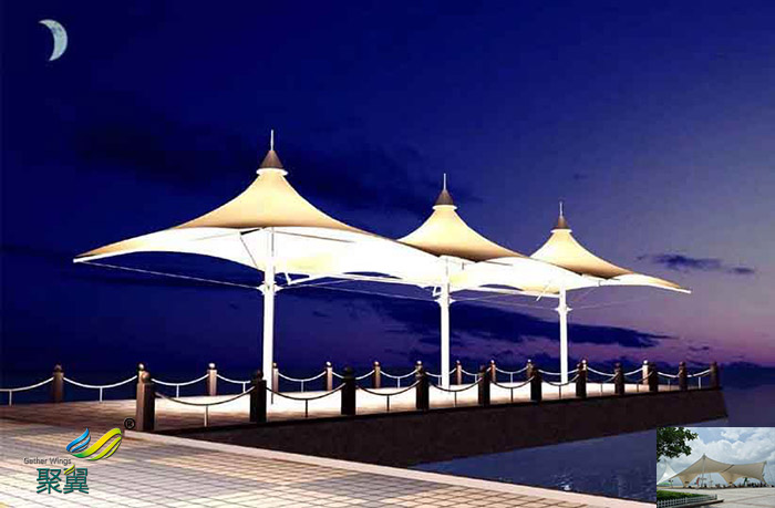 景觀張拉膜柔性,張拉膜結構不是剛性的,其在風荷載或雪荷載的作用下會產生變形。膜結構通過變形來適應外荷載,在此過程中荷載作用方向上的膜面曲率半徑會減小,直至能更有效抵抗該荷載。張拉結構的靈活性使其可以產生很大的位移而不發生較久性變形。膜材的彈性性能和預應力水平決定了膜結構的變形和反應。景觀張拉膜適應自然的柔性特點可以激發人們的建筑設計靈感。不同的膜材的柔性程序也不相同,有的膜材柔韌性極佳,不會因折疊而產生脆裂或是破損,這樣的材料是有效實現可移動、可展開結構的基礎和前提。