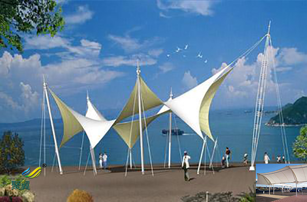 張拉膜景觀棚膜建筑作為性或半性建筑,膜材本身必須應完全滿足有關建筑材料防火指標的要求。以日本膜結構大國為例:他們早在20世紀80年代就已把膜結構成功地應用于諸多大型公共建筑中,并且玻璃纖維布基涂敷聚四氟乙烯膜材料(PTFE材料)也早已通過了國家防火測試試驗,但至今仍沒把膜材料作為不燃材料列入國家建筑標準,只是要求針對每個建筑單體膜材通過防火測試,滿足要求即可。