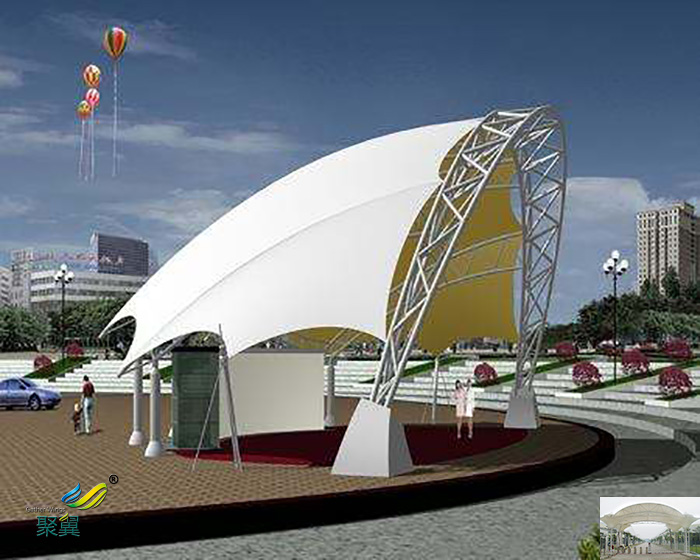 2.張拉膜傘景觀棚經(jīng)濟(jì)性:由于膜材具有一定的透光率,白天可減少照明強(qiáng)度和時(shí)間,能很好地節(jié)約能源。同時(shí)夜間彩燈透射形成的絢爛景觀也能達(dá)到很好的廣告宣傳效益。膜建筑屋面重量?jī)H為常規(guī)鋼屋面的1/30,這就降低了墻體和基礎(chǔ)的造價(jià)。同時(shí)膜建筑奇特的造型和夜景效果有明顯的“建筑可識(shí)性”和商業(yè)效應(yīng),其價(jià)格效益比更高。