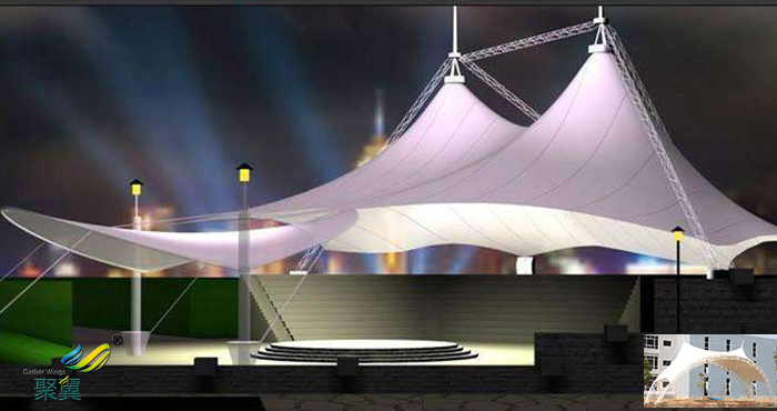 1、舞臺張拉膜結構的共同曲面外形使其具有激烈的雕塑感,膜面經過張力到達自平衡。