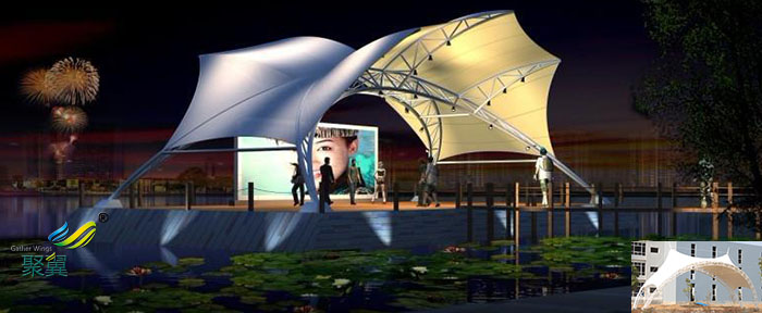 三、舞臺(tái)膜結(jié)構(gòu)景觀效應(yīng)性:文藝舞臺(tái)膜結(jié)構(gòu)新穎別致的膜建筑造型與傳統(tǒng)建筑相比可以突出其獨(dú)特性,而且也不會(huì)與周圍環(huán)境顯得突兀,整體造型適時(shí)適地融合周邊景致,與周圍環(huán)境相適應(yīng),相得益彰。特別是結(jié)合夜間的燈光設(shè)計(jì),會(huì)呈現(xiàn)出一個(gè)如夢(mèng)境般的風(fēng)景線。