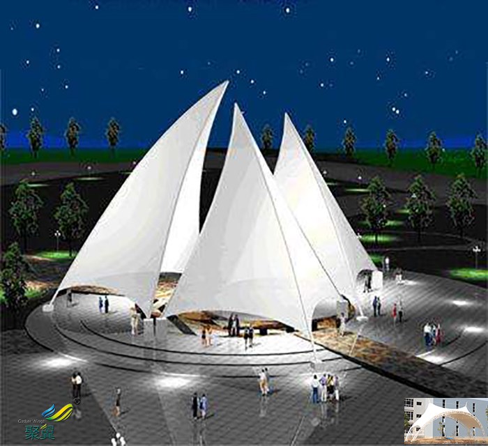 1、具有特定功用的建筑都可經過立意得以表達,舞臺膜結構的共同外形表現了建筑自身的天然美感。