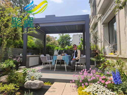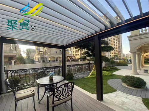 除了涼亭,電動遮陽防雨百葉涼亭,葉片采用鋁合金材質整體擠壓成型,葉片表面帶有水溝,在葉片關閉時可引導雨水進入兩頭的引水槽,再接入排水管。一個潮流專業的設計,為你的院子遮風擋雨。