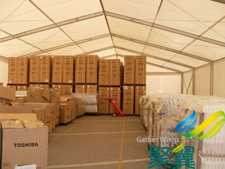 臨時倉庫圍簾采用白色雙層PVC合成纖維布。符合國家防火標準DIN4102 B1,M2。遮光性能優良。  所有配件經過熱鍍鋅防銹處理。  篷房透明窗采用高質量透明PVC制作。抗寒、抗褶皺。