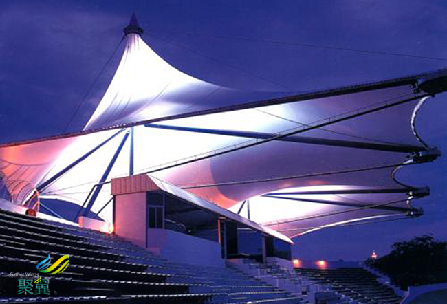 看臺膜結構建筑建筑造價:無柱站臺雨篷、候車室相對于其他結構造價不是高而是低。由于膜結構建筑屋頂較輕,相應減少了主體維護體系、基礎體系的用材量,同時無需二次維護裝修,省去了裝修費用,而且省掉將來很多維護費用,還減少了電能費用。  看臺膜結構建筑建筑環保:膜材的使用減少了空間用鋼量,減少了二次污染,施工現場減少了沙、石料、鋼結構焊接等用量,施工現場很環保,同時看臺膜結構建筑建筑膜結構進現場后只需漲拉就位,施工速度很快。