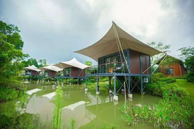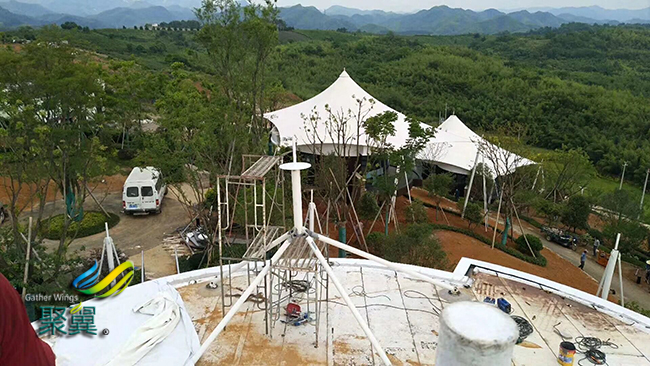 戶外酒店屋頂張拉膜結構形式靈活多樣鋼支承反吊氟碳纖膜結構可根據場地條件的不同,設計與周圍環境相協調的外觀,充分顯示了柔性結構的特點。戶外酒店屋頂張拉膜結構光學美感氟碳纖膜材料的透射率約為6%,戶外酒店屋頂張拉膜結構在日照下結構內部具通透性和明亮度,能滿足內部設備檢修的需求,戶外酒店屋頂張拉膜結構在夜間燈光照明時,光線透過膜材能達到特殊的建筑效果。