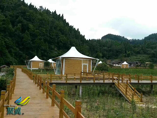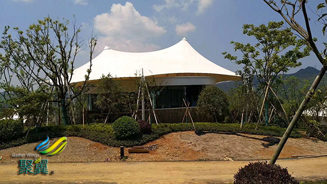 戶外酒店屋頂張拉膜結構選用了PTEF膜材,無論是美觀還是使用性能,PTFE膜結構都是非常合適的選擇。PTFE膜結構有著非常高的自潔性能又防火,戶外酒店屋頂張拉膜結構是以二氧化鈦與聚酯纖維而成,具有高強度透光率,熱吸收量很少。同時戶外酒店屋頂張拉膜結構能隔音吸音、隔熱防潮、不變形。