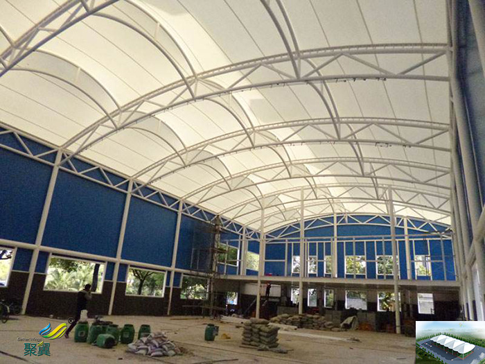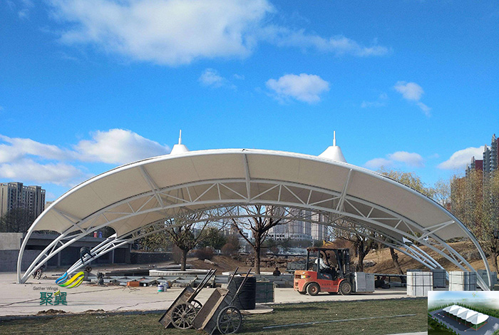2、膜結構體育看臺建造施工工期短,膜結構加工制造都是在工廠內完成的,縮短了施答工時間,從而也為企業節省了施工成本。