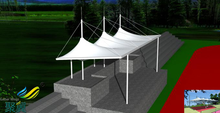為了解決鋼構配合鋁塑板的弊病,膜結構慢慢進入了看臺市場,相比傳統的建筑形式膜結構體育看臺的優點很多:首先它不僅滿足了造型的多樣性、夸張性,而且也完美的解決了對于大跨度結構用鋼量大的問題,往往對于大跨度的結構來說,起跨度尺寸就代表著需要大量的鋼結構來補足,然而對于膜結構來說,其特有的延展性和超高的的抗拉強度完美的解決了大跨度帶來的困擾,大大的節約了施工成本。其各種顏色的配比也使得其與周邊環境多了更多的搭配方式,膜結構常用膜材特有的自潔效果防水效果,降低了后期對于主體結構的維護費用。膜材質保年限最低10年,高的能達到25-30年的材料質保,這也使得設計成永久性建筑的設計初衷得到了完美的結合。而且其相對于鋼筋混凝土和純鋼結構來說還有一明顯優點---施工周期短(自重輕、結構簡單)。另外膜結構還有一優于其它結構的顯著特點——半透明性,白天能將陽光漫反射到結構以下,能完美的起到遮陽效果,還不影響其下方正常使用;在夜晚可以逆光照射,使得膜材表面發光,造就一個不一樣的視覺盛宴。