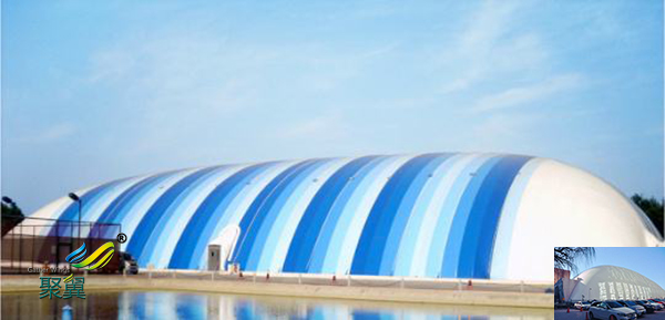 其氣脹式膜結構是單個膜結構件內充氣,使其保持足夠的內壓,多個膜結構件進行組合可形成一定形狀的一個整體受力體系。