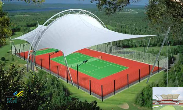 膜結(jié)構(gòu)體育看臺保溫隔熱,單層膜材料的保溫性能大致相當(dāng)于夾層玻璃,如果某建筑物對保溫性能要求較高,就不得不考慮采用雙層或多層膜,但雙層或多層膜又損害了建筑物的透光性能,一般來說雙層膜的透光率在4%~8%左右。透光性是膜建筑很吸引人的一個特點(diǎn),有時很難讓人在二者之間作出選擇。為使上述矛盾達(dá)到協(xié)調(diào)統(tǒng)一,針對某個建筑物就必須尋求一種特定的方法,如尋求一種透光性好的內(nèi)層膜材料等。
