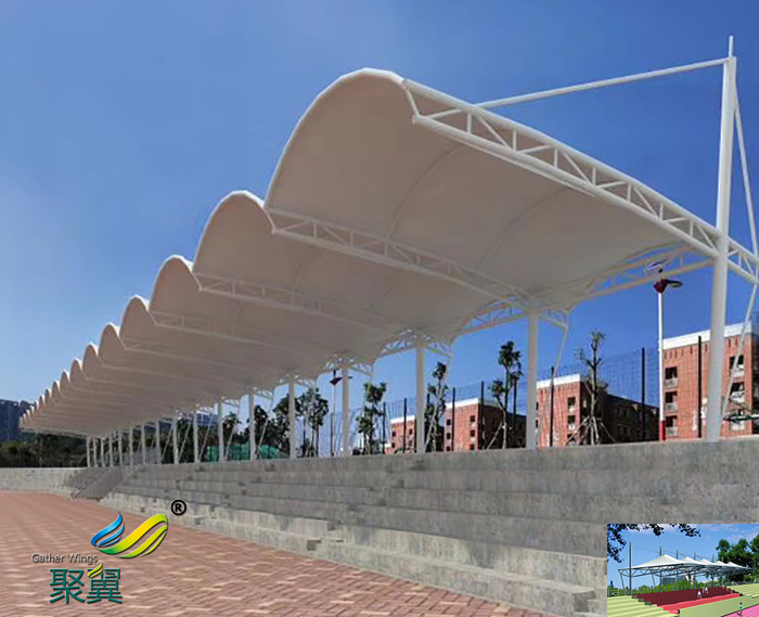 為了解決鋼構(gòu)配合鋁塑板的弊病,膜結(jié)構(gòu)慢慢進(jìn)入了看臺(tái)市場(chǎng),相比傳統(tǒng)的建筑形式膜結(jié)構(gòu)體育看臺(tái)的優(yōu)點(diǎn)很多:首先它不僅滿足了造型的多樣性、夸張性,而且也完美的解決了對(duì)于大跨度結(jié)構(gòu)用鋼量大的問(wèn)題,往往對(duì)于大跨度的結(jié)構(gòu)來(lái)說(shuō),起跨度尺寸就代表著需要大量的鋼結(jié)構(gòu)來(lái)補(bǔ)足,然而對(duì)于膜結(jié)構(gòu)來(lái)說(shuō),其特有的延展性和超高的的抗拉強(qiáng)度完美的解決了大跨度帶來(lái)的困擾,大大的節(jié)約了施工成本。